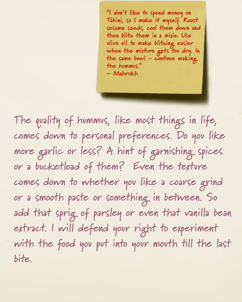 To know more about the histories of hummus, fascinating cookbooks from the Abbasid era and the infamous hummus war between Israel and Lebanon, which makes me wish that was the only kind of conflict in the middle-east, read this and then this.